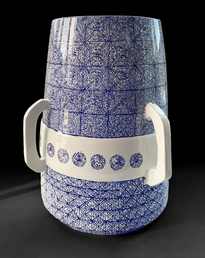 He titles a set of wide open vases 'Jarres de Clot et Naâma' or 'Jars from Clot and Naâma' that are made in ceramic using a distinct indigo blue common in Andalusia and the Maghreb. Named after the industrial neighbourhood of El Clot in Barcelona and the Western Algerian city of Naama where recently an ancient terracotta vase was found in its arid desert landscape. Using its shape Koraïchi produced these ceramics in his studio in El Clot. These white ceramic jars are adorned with blue mystical verses, diagrams and charts. The ode to Blue comes not only from a Azur Andalusian heritage but its significance within Sufi esotericism. According to Koraïchi, blue represents invisibility. We perceive the skies above as Blue but we cannot capture its colour for it is as intangible as thin air , similarly when we swim the Mediterranean we cannot carry away with us the aquamarine blue of the sea water as it turns transparent when scooped from the sea. Here he makes a deep metaphorical reference to our souls and shadows that accompany us through our lives and into our coffins upon death.