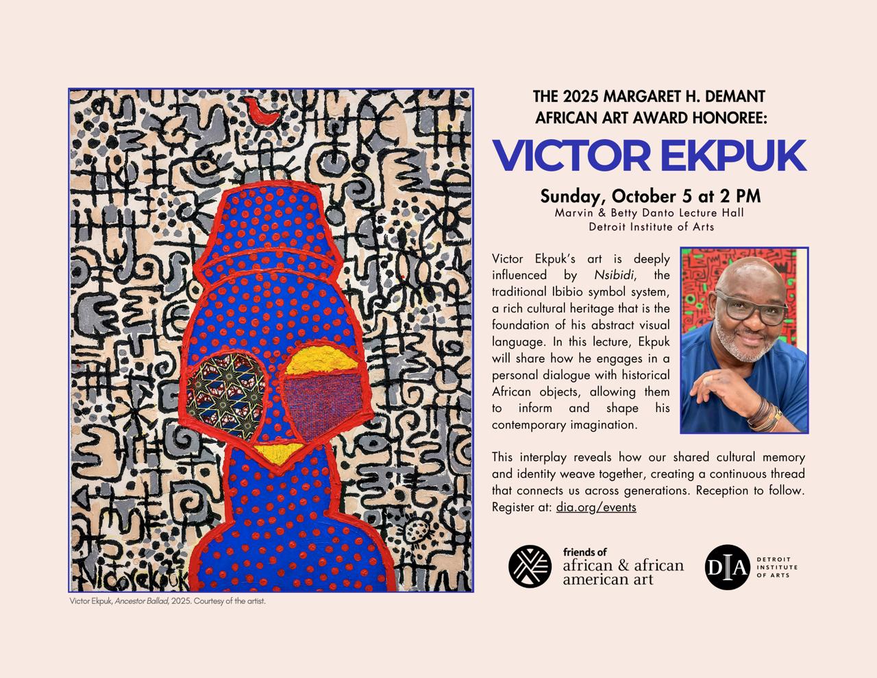 Victor Ekpuk's art is deeply influenced by Nsibidi, the traditional Ibibio symbol system, a rich cultural heritage that is the foundation of his abstract visual language. In this lecture, Ekpuk will share how he engages in a personal dialogue with historical African objects, allowing them to inform and shape his contemporary imagination.